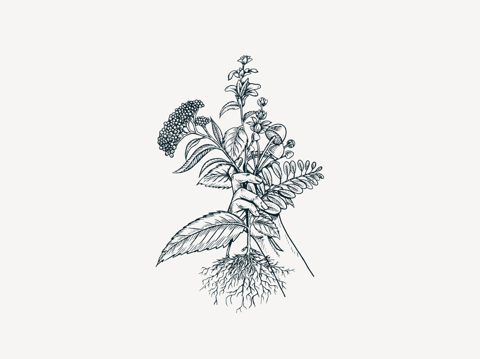 In the branding We wanted the illustration of the Grow Good Co to reflect the company’s slogan, Holistic Herbal Wellness. We’ve created an organic hand-drawn illustration of a hand offering their signature plant elderberry, holy basil, wild mushroom, and ashwagandha. And for the packaging, we created two types of labels, for fresh herbs and for the elderberry making kit. To balance the feminine and soft look of the branding, added a zigzag cut out for the labels.