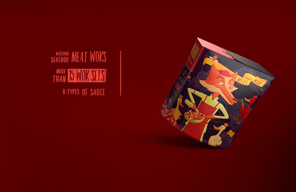 Identity of the project is bright and recognizable thanks to hand-drawn typography and amusing illustrations. Two Fox-Chiefs will gladly cook either meat or vegetarian wok for you, and the Ducks will make sure of the quality of your dishes.