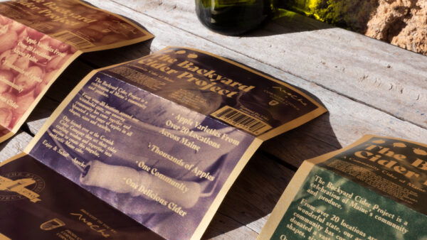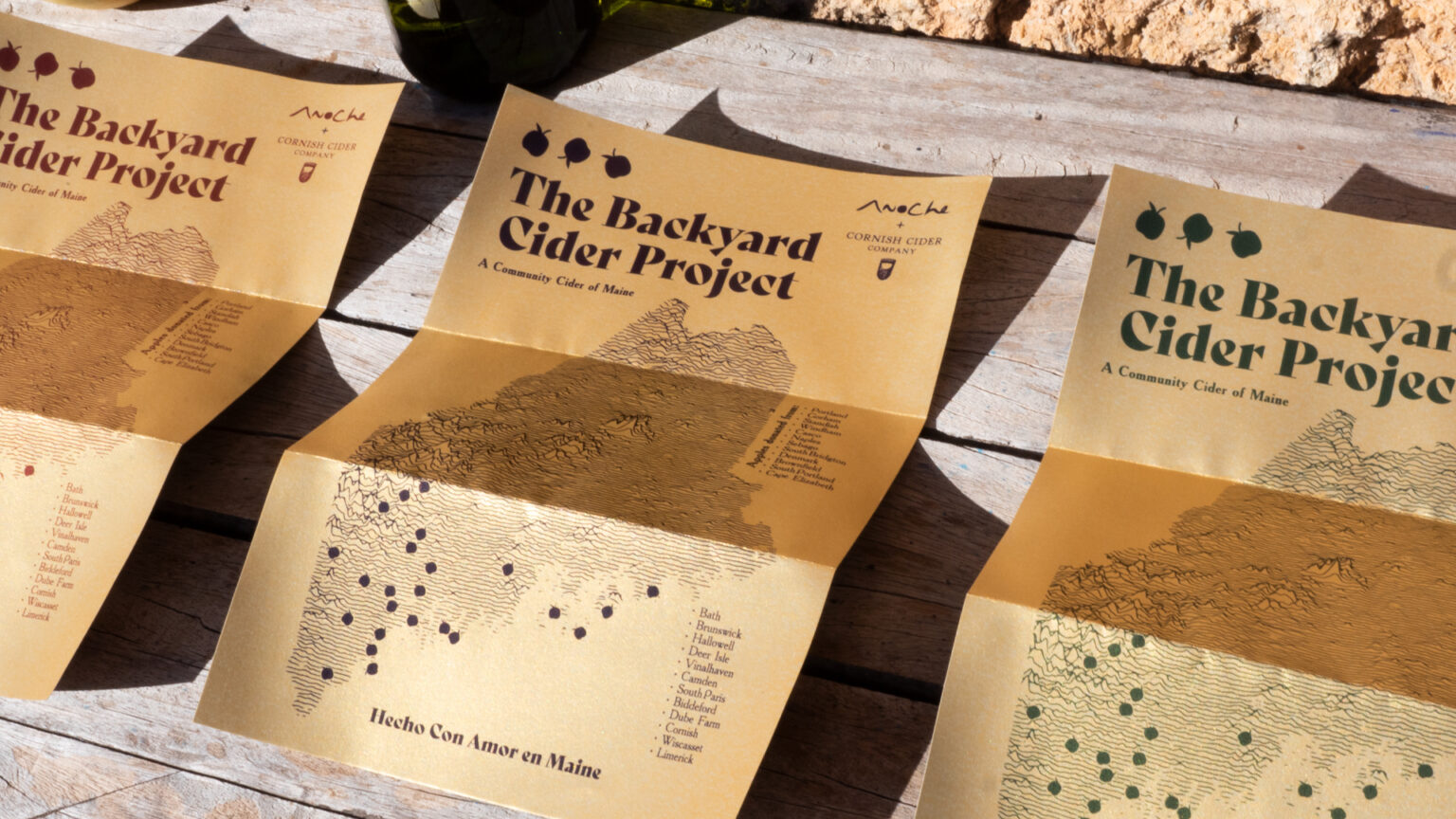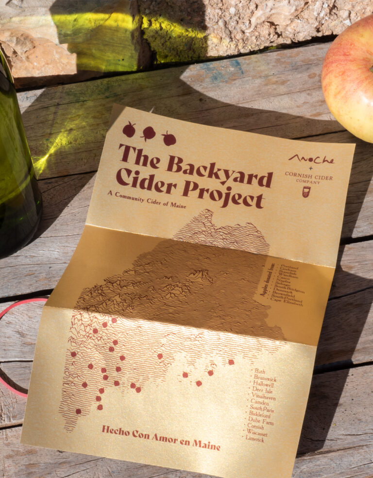 Our friends over at Anoche were in need of a label design for their custom cider called The Backyard Cider Project. To communicate the raw and organic community driven cider, we delivered an interactive label for a cider that is to be shared with friends and loved ones around a table. The front of the label has all the basic pertinent information needed on a cider label, held around the bottle with a simple rubber-band. With an intentional small-run, craft feeling, the consumer can then remove the label, unfold it and learn more about the project. On the backside there is a line map of Maine with a list of the regions from where the apples were donated including correlating apple icons on the map.