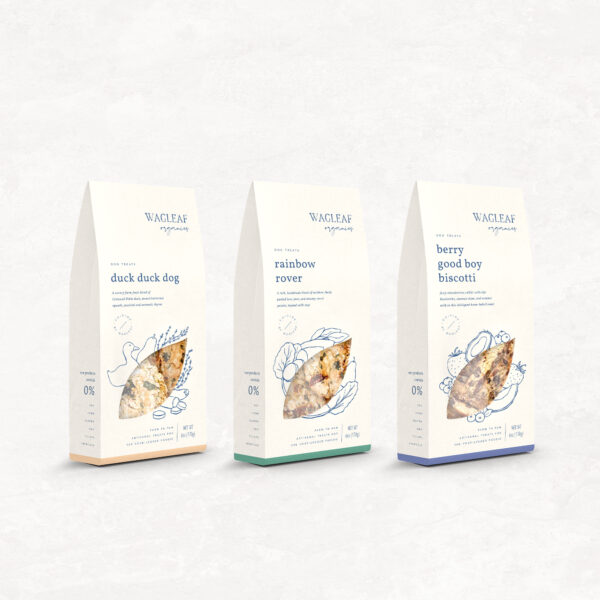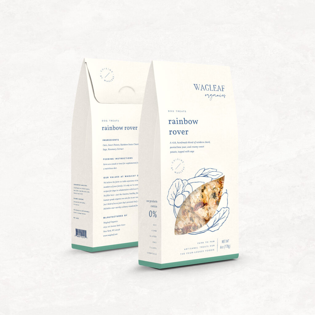 Wagleaf Organics is a New York–based dog treats brand, who approached Karolina Król Studio with an already developed brand identity and were looking to create some packaging designs for their new natural and sustainably made dog treats. Their goal was to create a brand new culinary experience for your dog. They’ve realised that pet owners have always been trying to find ways to let their dogs engage in the same experiences with them, and that they’ve been always looking for more pet friendly restaurants but few are available. Therefore, Wagleaf Organics decided to bring the pet-friendly restaurant experience straight to their door.
