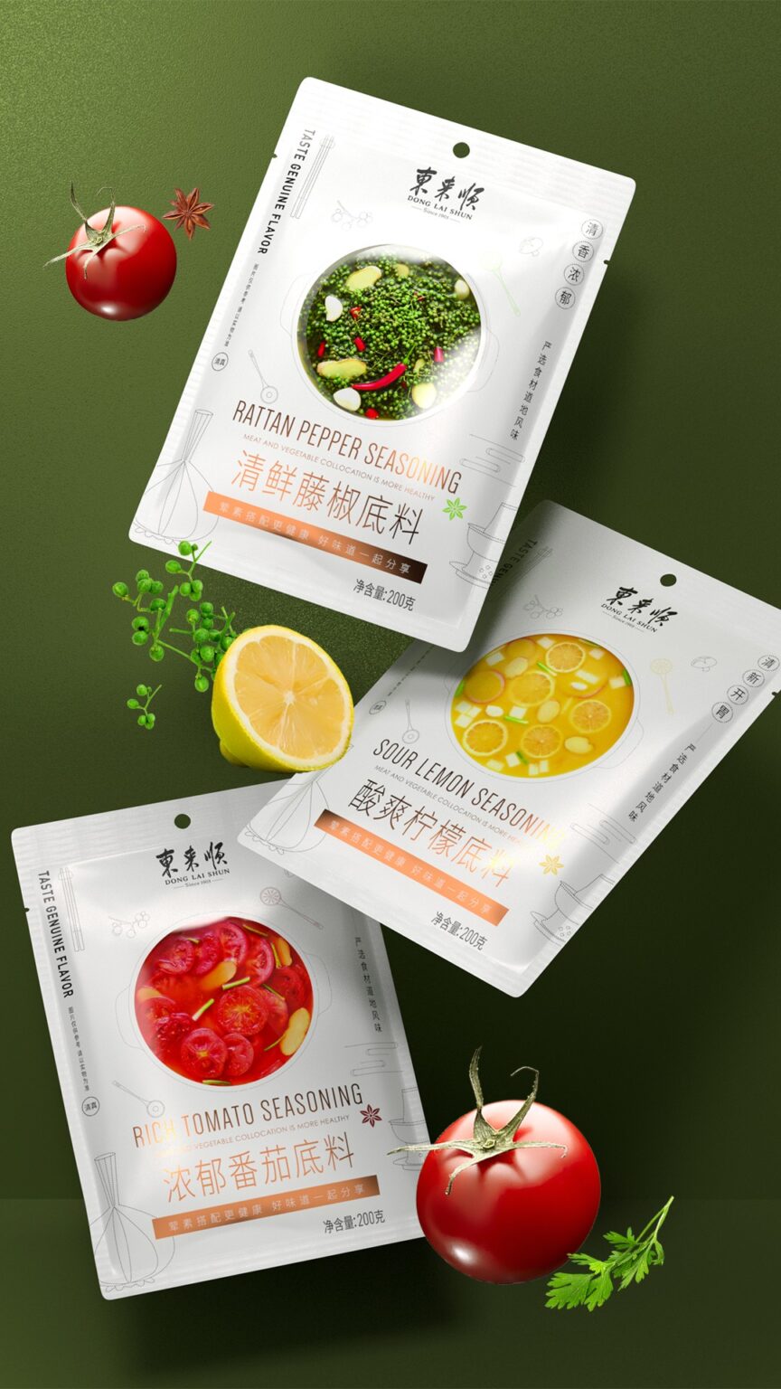 The packaging design of condiments, dipping sauces and hot pot bases abandons the greasy visual sense of heavy tones. The new layout and color selection gives people a natural, list, healthy and delicious feeling, becoming a new bright spot among many similar products.