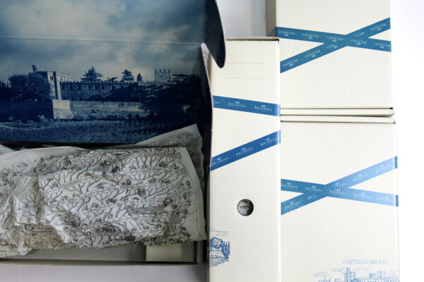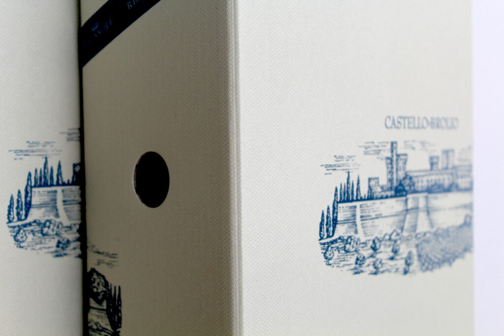 Light and bright design, with a fresh and contemporary cut … this is our proposal for the self-assembling two-bottle boxes made for the Ricasoli 1141 winery. Delicate graphic customization leaves space for the paper with embossed texture that does not anticipate the interior where the magical view of the Brolio Castle introduces the quality of the wines contained. A hole on the side of the box suggests creative reuse as a binder.