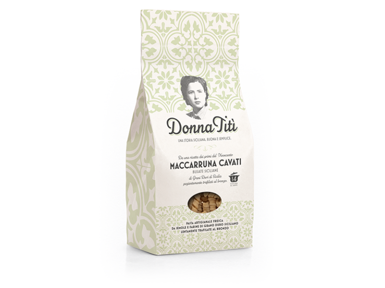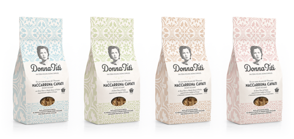 DONNA TITÌ / BRANDING “Titì! … Titì! … Titì arrived!” “Abbanniata” she echoed in the fields when it was lunchtime and announced the refreshment. She came out suddenly on the back of the mule, with the baskets in the “canceddi”, full of busiate with meat sauce. Nobody made homemade pasta like her, Donna Titì took the party to the fields and the hard work, for a moment, was sweetened. This is how Donna Titì entered the myth on the back of a mule. Her culinary deeds become a legend and are passed down orally to the present day. At that time, in the countryside of Santa Ninfa, in Sicily, it was not customary to write recipes in a notebook, but they were handed down verbally, from mother to daughter. Donna Titì’s branding project aims to give shape to this legend, true identity and a plausible narrative, which starts from an old photo and the recovery of a “perfect recipe” to prepare fresh pasta and meat sauce. Through the line image of Donna Titì, the search for typefaces, iconographies and colors typical of her time and the use of natural paper for the packaging, we intended to give shape to the myth.