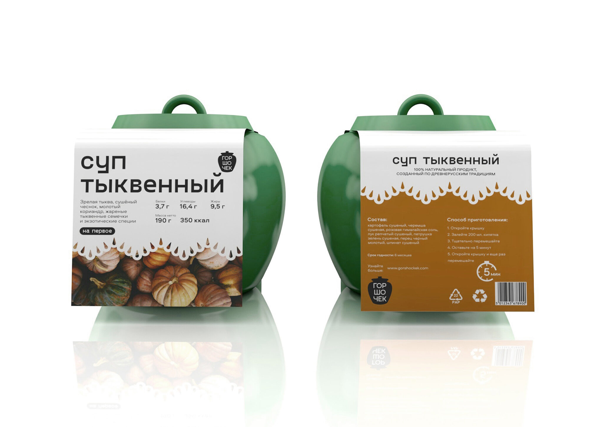 To convey this idea of naturalness and healthiness, a clay pot was taken as the main metaphor for the packaging. Such reference to Russian traditions helps to create an association with warmth, comfort and homemade food