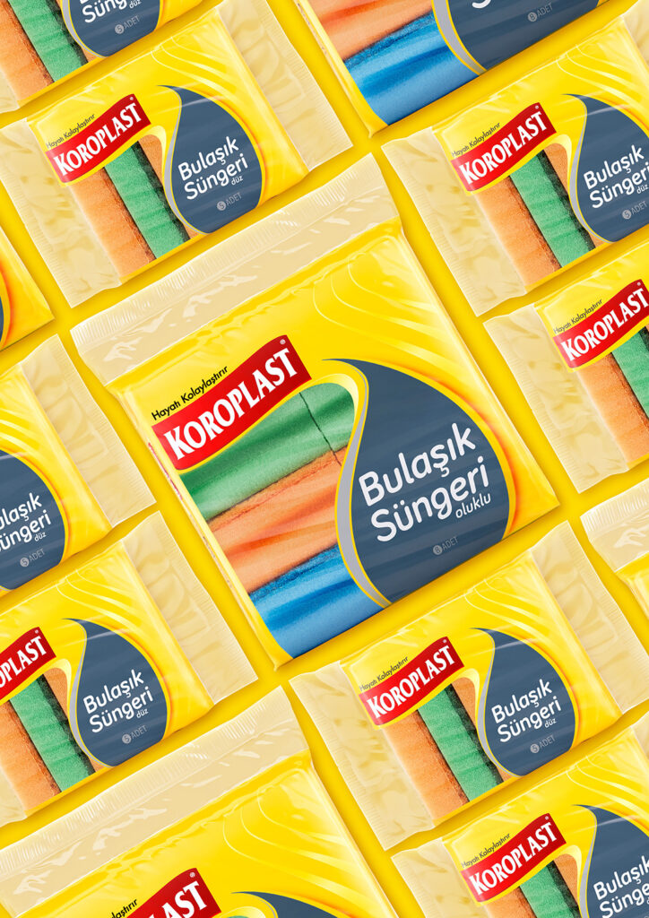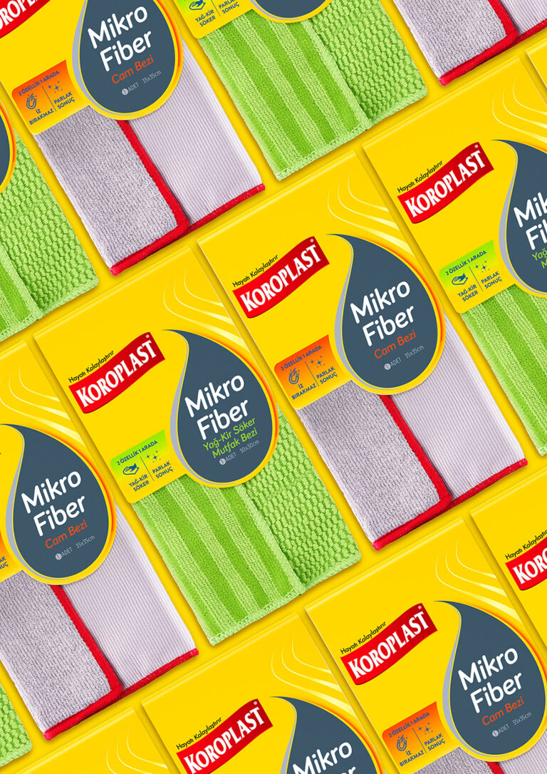 The cleaning products group designed to be presented under the Koropolast brand consists of cleanings cloths and kitchen sponges with various characteristics, colors and textures. The anthracite drop shape placed on the yellow background represents the element used to create a common design language for the entire group. The transparent or open parts of the packing were adapted to the design in line with the same drop shape in order to facilitate the users’ experience with and observation of the cloth and sponge texture and colors. While the curved line surrounding the drop shape was targeting to provide a feminine touch to the packing, the shiny metallic print on the left side emphasized the technological and innovative cleaning. Along with gaining the users’ appreciation during shopping, the target of the packing was also to provide a quick perception of the product on the spot and its differentiation from the competing brands.