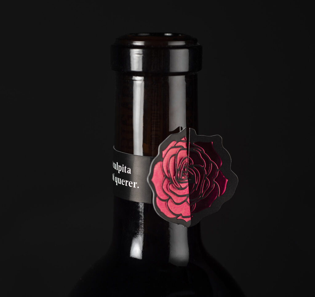 This allows the bottle to show through the holes while drawing a lot of attention with its elegant shine. The trococonical bottle goes perfectly with this label due to its wide shoulders that resemble the silhouette of a woman. To finish off the bottle we made a die-cut collar that goes on the cello of the bottle that symbolizes a carnation, the most characteristic flower of the copla and that they usually wear in their hair in performances.