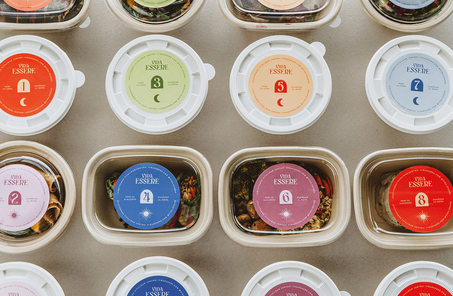 We designed a unique and impactful identity for Vida Essere, where typography plays a primary role, to prioritize reading and effortless understanding. Simplicity in its effectiveness… In order to reflect the living and energizing food, we used a colorful palette on the food program packaging, allowing each color to identify a day of the week. We used a more neutral and elegant palette on the Essere product lines.