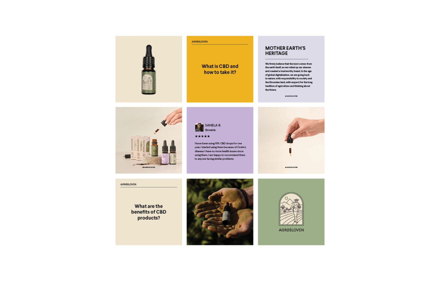 Calming, nurturing and bright visual identity reflect exact such effects of enjoying hemp products. In communication, the brand does not focus on the problems it solves but the positive effect it brings. Logo reveals brand’s own production from seed to the final product, which is depicted in the sower. In his background is Slovene’s highest mountain Triglav, which can be seen from Agrosloven’s fields and points out the local origin and production of the products. The color scheme symbolises calmness, touch with nature and the release of creativity enjoying CBD products brings.