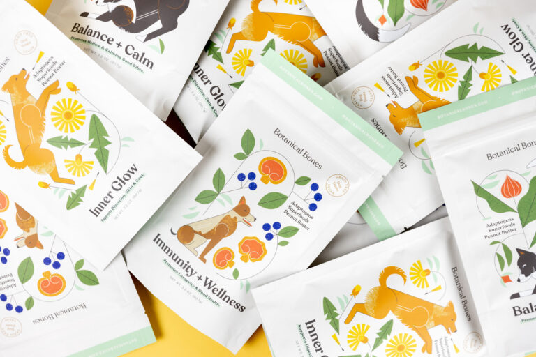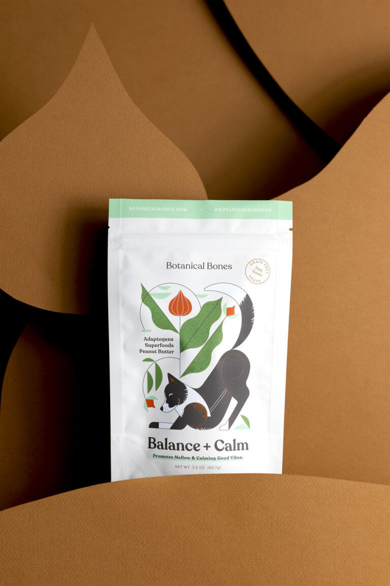 We wanted the pet product branding to feel warm, friendly, and also give the dogs depicted on each bag, a lot of character that reflects the nature of the treat ingredients. For inspiration, we looked to the fantastic work for Charley Harper in his unique way of capturing animals with geometric forms. The bags feature three different canines that are appropriate for what each treat’s ingredients target. The first bag, Inner Glow has a happy golden retriever, Balance and Calm features an anxious Border Collie, and lastly Immunity and Wellness features a sweet mixed rescue dog.