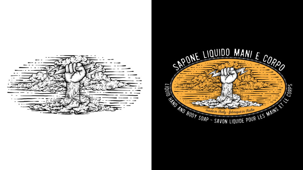The family of labels is coordinated by the black background color, and by a central illustration that varies according to the product. Each illustration is placed in the center of an orange shape which gives a very strong color accent and gives it immediate shelf visibility.