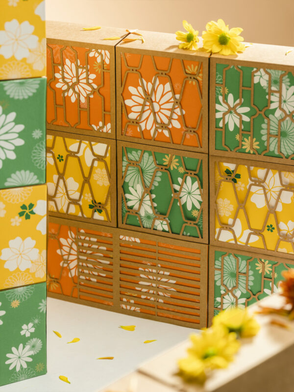The gift set “Khoi Sac”, in the meaning of “Blooming flower”, was conceptualized and designed by Bracom Agency on the occasion of the 2022 Vietnamese Lunar New Year. We yearn for launching a product to highlight the Spring atmosphere and the beauty of Saigon in Tet by combining the traditional iconic with the innovative and modern visual language to keep the integrity, high-end gift set. Borrowing the iron window frame images in the old apartments in Saigon, we drew very colorful flowers in full bloom behind each window, symbolizing the scene of the house eagerly decorating Tet with many branches and colorful flower pots, all bringing a bustling Spring atmosphere. We would like to deliver a meaningful message as we wish you a very bright new year, lots of joy, luck and success and prosperity. The floral pattern: We illustrated flowers that are familiar to each Vietnamese family as Chrysanthemum, Carnation and Kalanchoe. Although each family has their own favored flowers, everyone, in the common point, long for bringing the atmosphere of Spring and Tet into their homes through the fresh appearance of flowers. Floral motifs are printed by silkscreen technique on Orange, Green and Yellow fine art paper, resulting in eye-catching and vibrant gift boxes. The green represents plants and nature, yellow sketches the soon morning sunshine of the early spring days, and orange appears for the vitality and abundant energy for a new beginning. With the above color schemes, in addition to the meaning of gratitude gifts, these are also very appropriate decorative items to place next to the cake box and flower vase in the family during Tet this year.