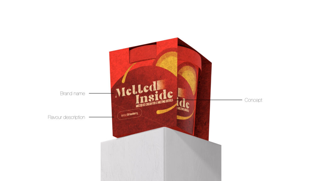 This packaging for a melting ice cream aims to raise awareness about the continuous increase in temperature that affects the poles. We used recyclable materials for the packaging, such as sugarcane bagasse and an environmentally friendly polymer made from corn starch, which could easily degrade to avoid contamination.