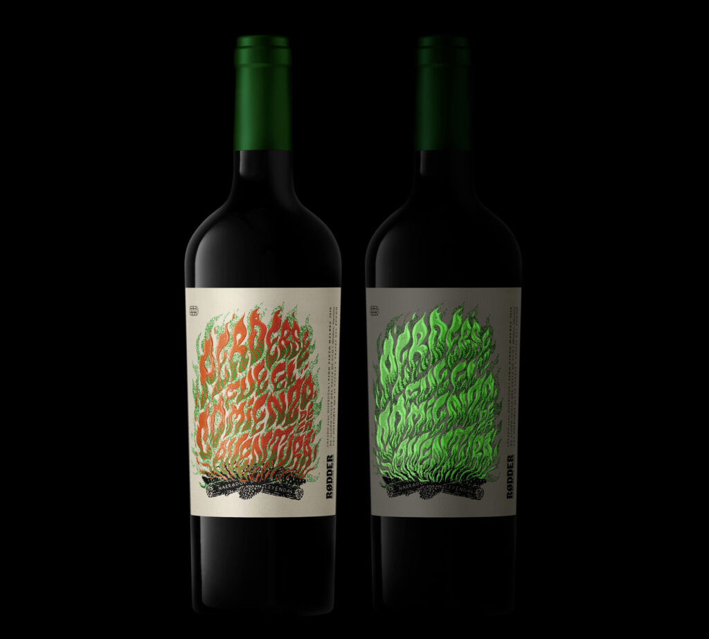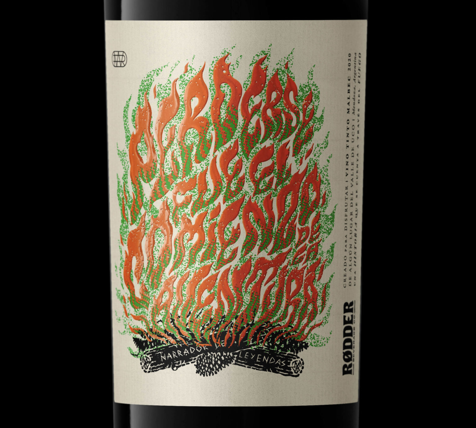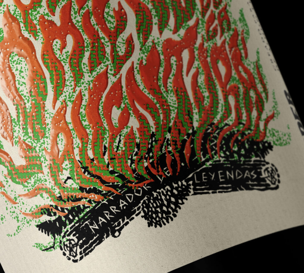 We were inspired by the psychedelic posters of the 70s. Their impact and gestures were what we needed to transmit a warm fire, which invites us to delve into it and discover what it wants to tell us. The entire typographic proposal is handmade. The labels feature a glow-in-the-dark ink that illuminates what the fire has to say to us.