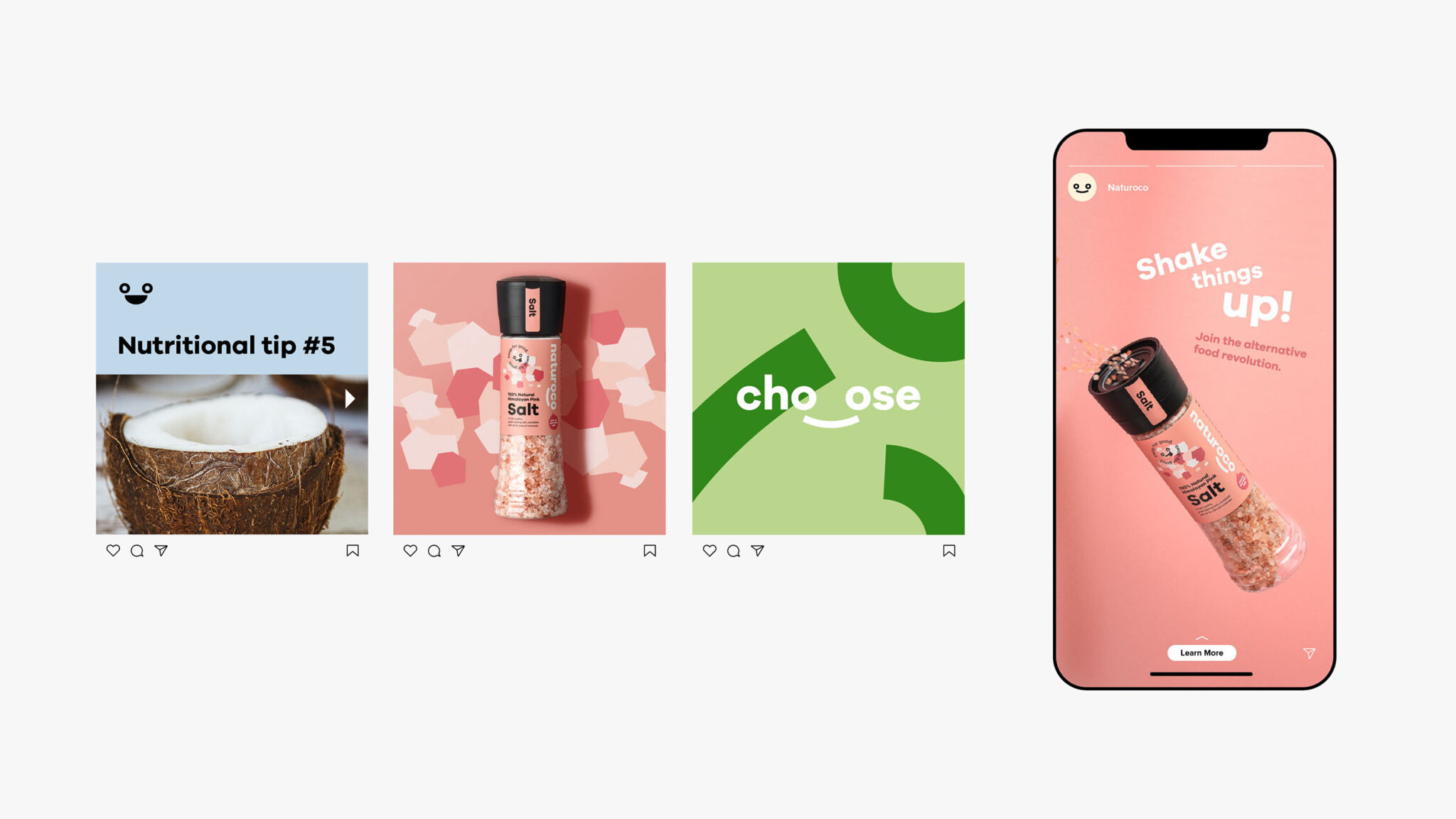 With food education being a core part of the brand offering, a mechanism for delivering the information and messaging had to be created. Introducing ‘Roco’, brand ambassador and Naturoco mascot. A simple, cheerful icon was designed to represent Roco and integrated into the Naturoco logo taking advantage of the double ‘O’ in the name. Combining the icon with humourous, friendly copy and call-to-actions, Roco becomes the human-like face and voice of the brand when communicating with the consumer.