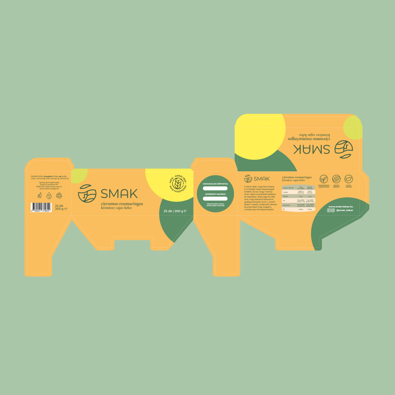 The packaging emphasizes high quality Hungarian ingredients, tradition and expertise along with a modern and youthful point of view, which aims the target audience who are young adults in cities. Its colours and clean shapes bring the customers positive emotions. The shades represent the ingredients and flavouring, the rounded forms give you the shapes of the biscuit and sweet taste. The inside of the box includes a light story that gives the customer some possibility for self-awareness and mindfulness. The whole brand of SMAK communicates harmony, energy and satisfaction.