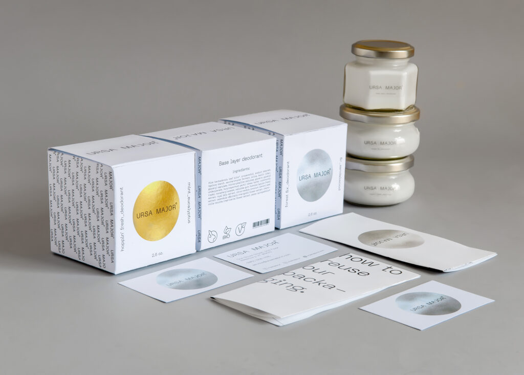 Ursa Major is a cosmetics brand, which mostly uses natural ingredients. My concept with this rebranding was to make packages which are reusable. But not only in the usual way, like making eco-friendly and „nylonless” packaging, but also designing an aesthetic, which everyone would like to keep and use after the products are out. Because the products of this brand are clean and free of harmful substances, I made a minimal design referring to the purity of the brand. I came up with the idea of making cream deodorants, which are kept in glass jars (this is the main point of this project), as being more environmentally conscious. The original products still have plastics in their packages, so my redesign is mostly about leaving plastic from the packages and using paper and glasses instead, while creating a new, clean design.