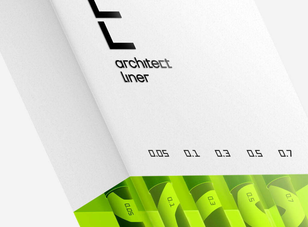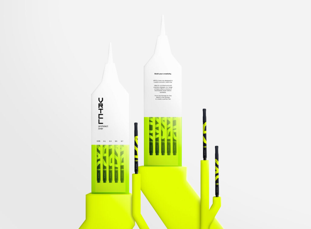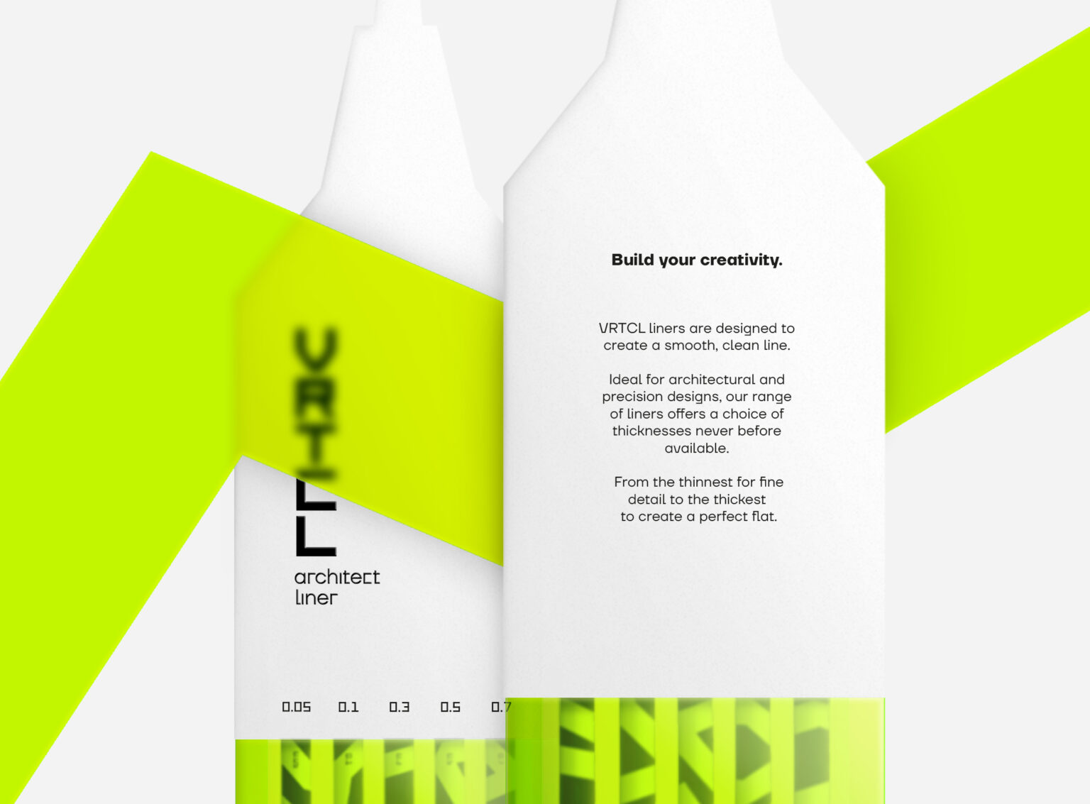 The verticality of skyscrapers sometimes makes us dizzy and the straight, very geometric lines typical of American buildings fascinate us. These characteristics inspired me to create the typography of VRTCL. The evocative name and the layout of the text evoke the verticality of our cities. This brand of liners for architects uses these aspects to communicate in a simple way. The vertical letters VRTCL are obvious and the baseline “architect liner” gives rhythm to the logotype. The fluorescent green color brings light. Essential in architecture, light is omnipresent in skyscrapers, hence the choice of this color. VRTCL liners allow architects to imagine ever higher buildings.