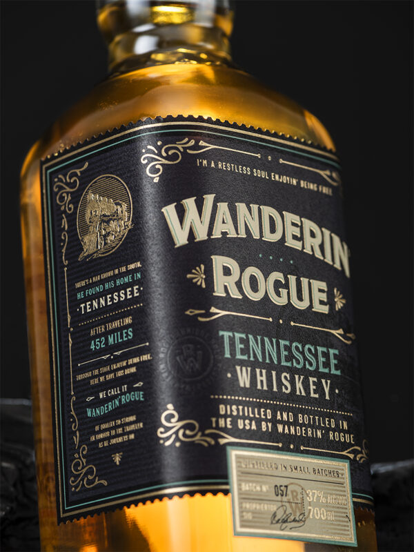 Exploring the history of Tennessee brought forth stories of the interesting characters who once journeyed around this state and further connected the project to the world of 1800s train travel. This led to the illustration of the train on the label and old saloon-style typography and flourishes. It also inspired the naming and storytelling. We imagined Wanderin’ Rogue as a restless, traveling soul making his way across Tennessee. This whiskey is dedicated to him and all of the other restless souls out there.