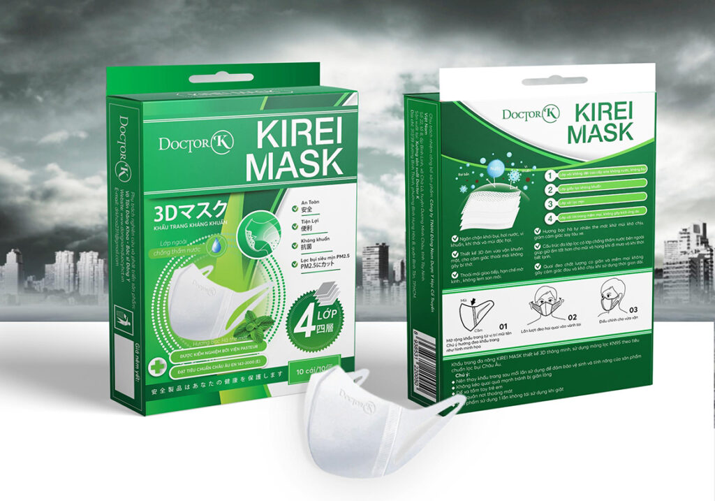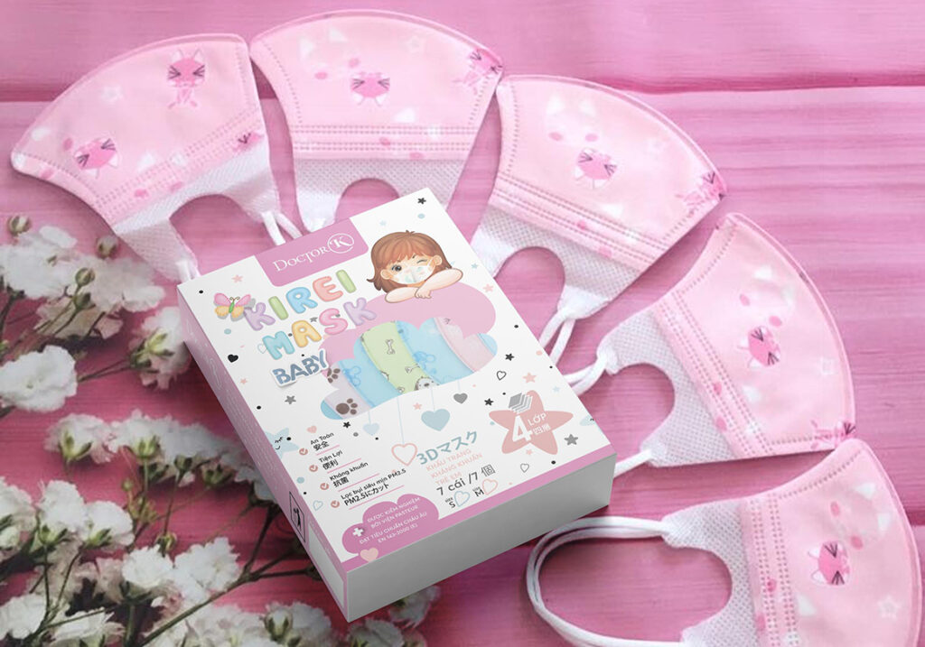 Tested by the Pasteur Institute, 3D Doctor K – Kirei Mask is an antibacterial product manufactured according to Japanese standards with an advanced multi-layer structure capable of filtering 95% of dirt and bacteria. Besides many effective uses, modern and smart 3D design is also one of the big plus points of Doctor K – Kirei Mask. In addition, the softness of the strap is committed to bringing a pleasant and comfortable feeling to the user. In cooperation with the brand, BZCMarket has developed the packaging design for the Doctor K – Kirei Mask 3D mask line in the form of a convenient box. The main colors of the package are blue, green, and pink, respectively, with 3 types of 3 layers, 4 layers with mint flavor, and masks for children. Images of large masks and detailed simulations of human respiration are placed at the center of the packaging design. In addition, the circular lines around the mask further emphasize the antibacterial function and optimal protection of the product. For children’s masks, the packaging design is embellished with lovely images.