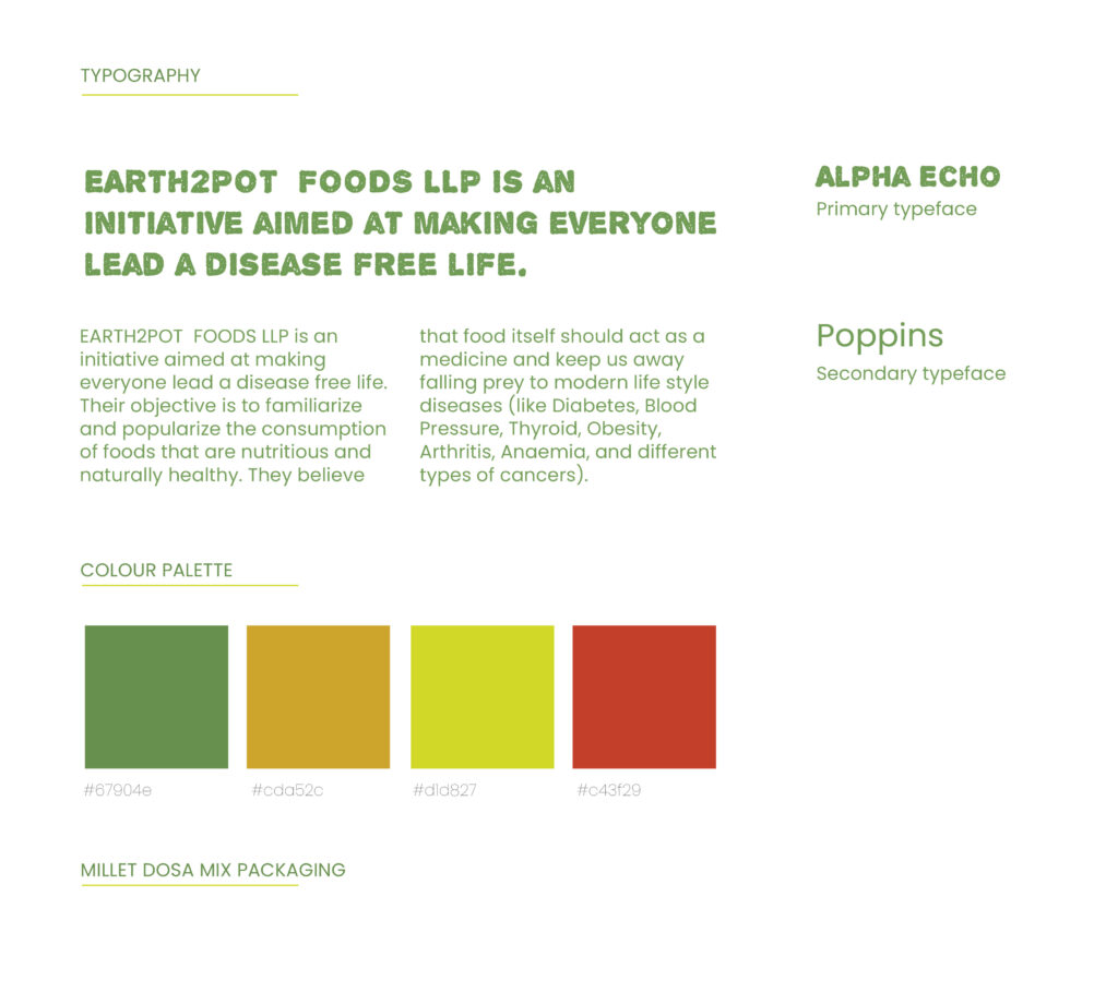 EARTH2POT foods is an initiative aimed at making everyone lead a disease-free life. This project aims to understand different ways to look at branding, as ‘encouraging people to eat more nutritious food. To simplify, clarify and visually appealing. The new visual identity promotes the brand values like trust, health and transparency. The visual elements evoke a sense of freshness through warm colour pallete, organic illustrations, simple layout and smooth yet trustable shapes. The tall leaves show growth and freshness. The vibrant colours give an earthly feel to the brand.  The overall composition is arranged to visually appeal to the brand name as well as build a bond of health.