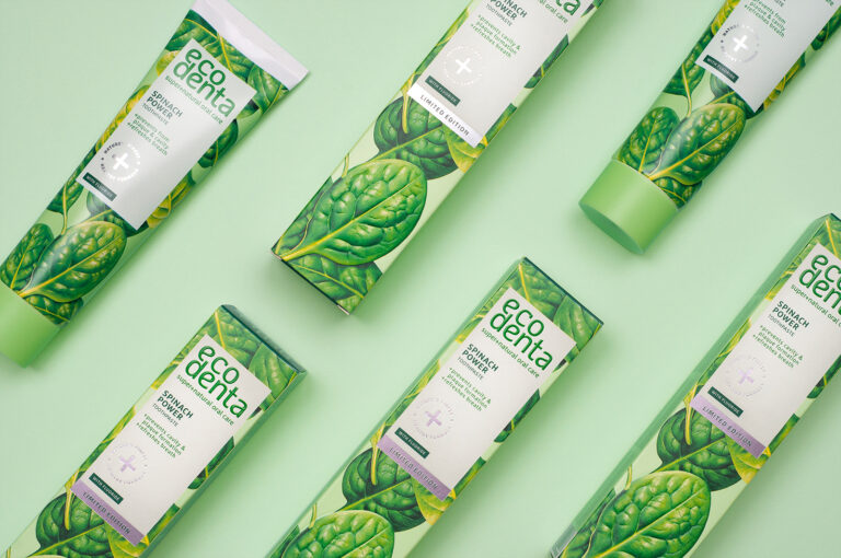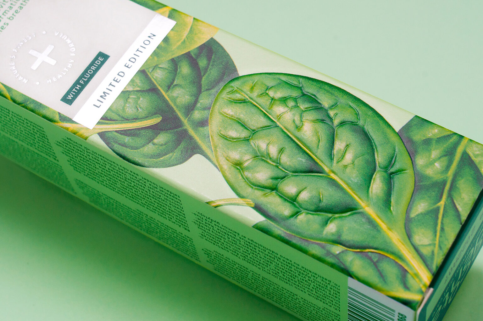 Spinach is the essential ingredient of this toothpaste, so for the packaging, we used large drawings of freshly looking spinach leaves. The illustration covers almost the whole packaging area and dominates in the design to make it look more limited edition. Such a design solution is different from other Ecodenta’s, and it stands out from them.
