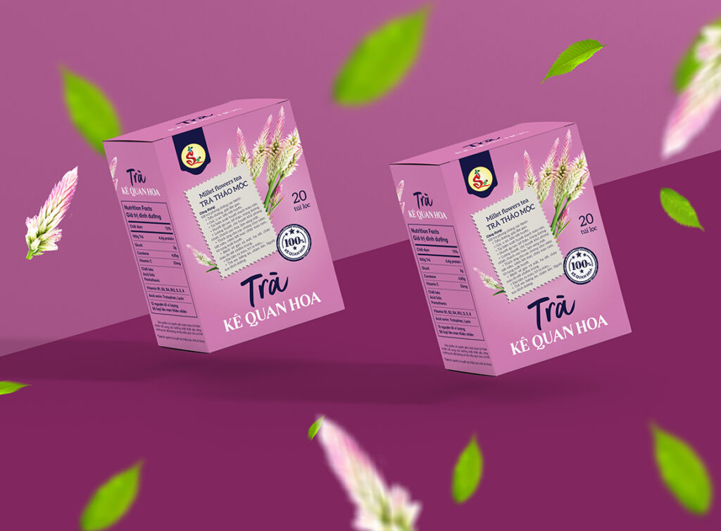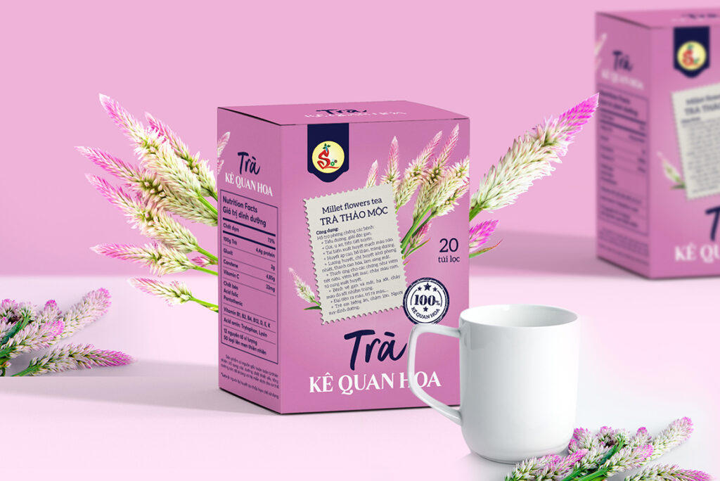 In the context that Vietnamese consumers are gradually switching to consuming beverages derived entirely from nature, rich in nutritional value, herbal tea product lines are also becoming more and more popular in the market. Besides popular teas such as lotus, chrysanthemum, licorice, millet tea (also known as cockroach flower) is also a favorite choice of many people, especially women. Towards sophistication and closeness to nature, BZCMarket has designed the packaging for Ke Quan Hoa tea with a pink color inspired by the original pink color of this flower – the main ingredient of tea. Enhancing convenience, the product includes 20 filter tea bags placed inside a high-class paper box. In addition, the image of millet flowers also appears on the packaging design to help users easily recognize and improve brand recognition when looking to buy products.