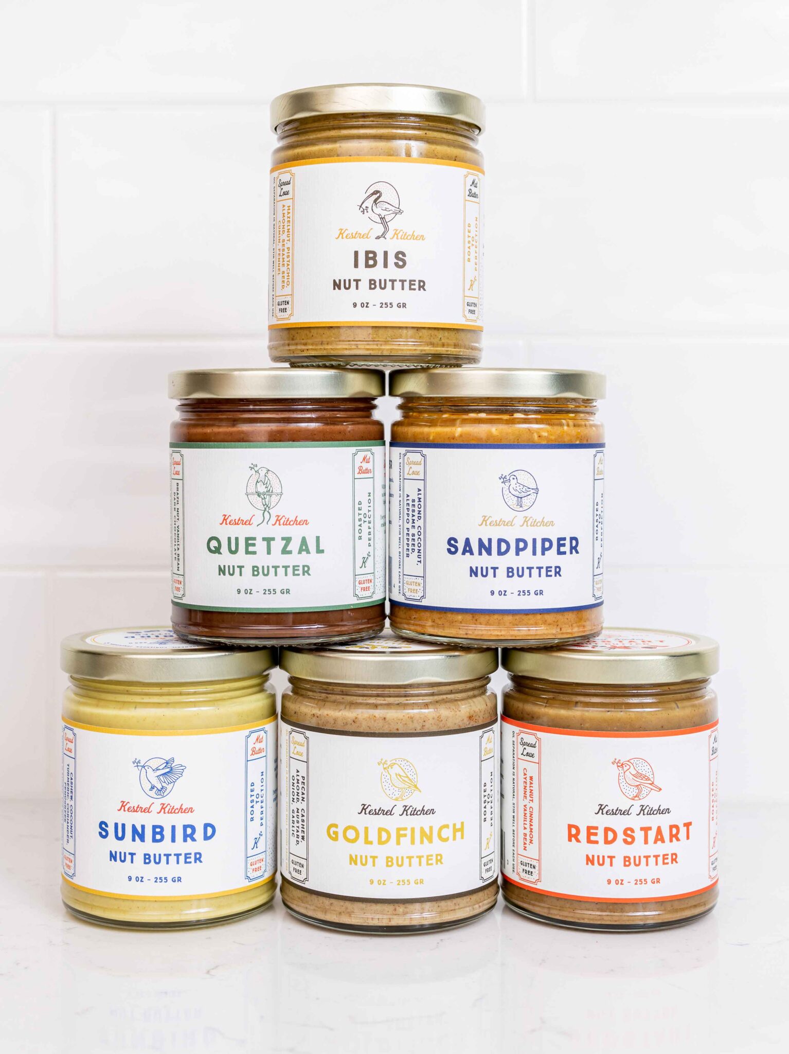After many conversations between Zeki (Creative director and Designer, Zeki Michael Studio) and Mackenzie (founder of Kestrel Kitchen) both sides decided that each and every nut butter product in the Kestrel Family should feel different from each other in character. The focus was to create something clean, fun and playfully unique. Inspiration was taken from birds and their relationship with nuts and seeds.