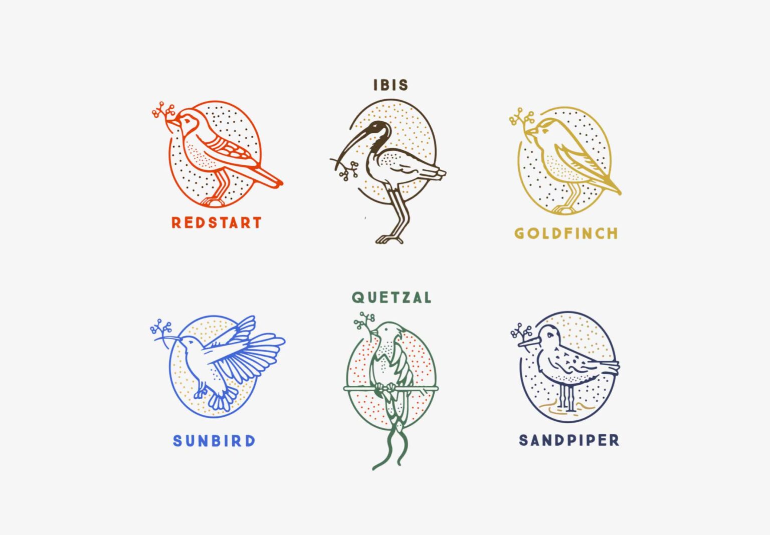Each bird has a different character, but all give joy and spread a positive feeling to their surroundings. With this fun idea Zeki Michael Studio set out to create a tasty and positive brand identity and illustration/label system featuring 6 bird types; Redstart, Goldfinch, Quetzal, Sunbird, Sandpiper and Ibis.