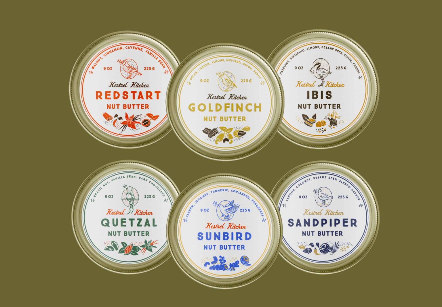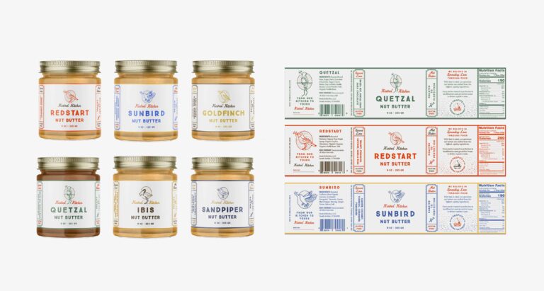 When Kestrel Kitchen reached out to Zeki Michael Studio to work on their range of nut and seed butter blends, they were aware that many nut butter brands already in the US market were focusing on commercial branding with realistic & traditional nut illustrations. It was decided that things were going to be approached differently and were going to be contrary and ambitious in this packaging project.