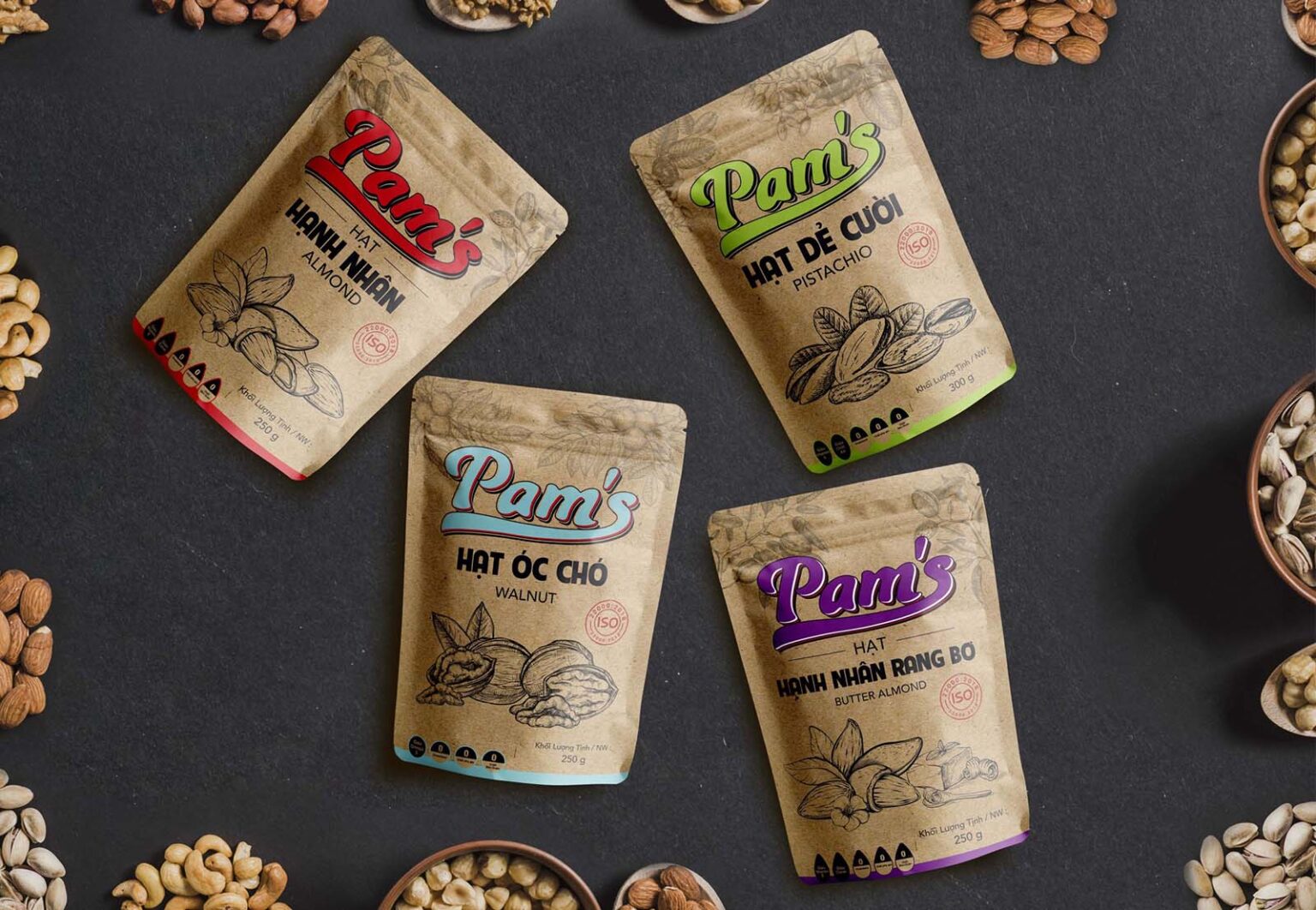 Accompanying a reputable brand like Pam’s, BZC.Market is responsible for designing packaging for cereal products. Inspired by the familiar nut brown color, all these packaging focus on reliability, integrity and natural products. The three nos: no cholesterol, no additives, no preservatives of the product are also focused and prominent on the front of each package.