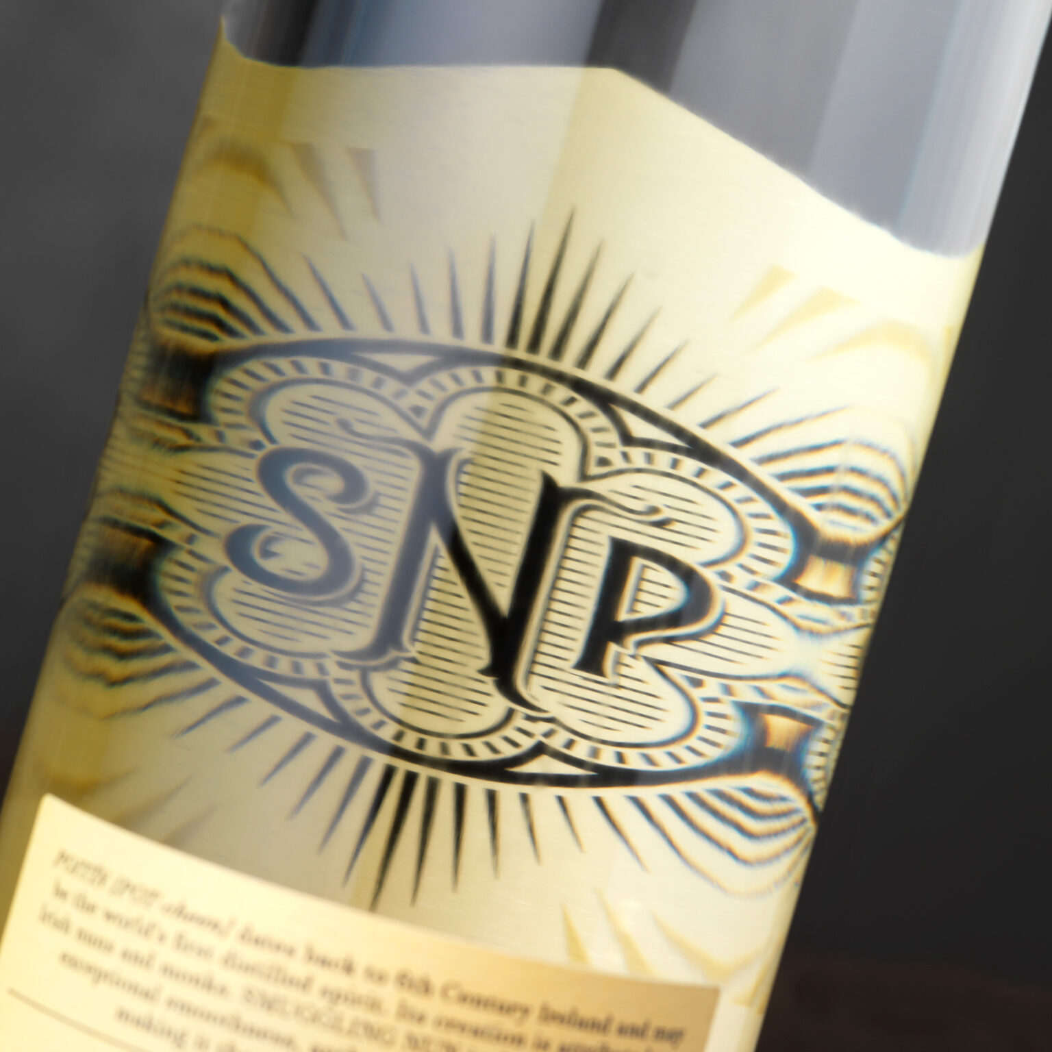 Inspired by gothic architecture and other classic Irish-inspired iconography, the label shape evokes the stained-glass windows of historic cathedrals. A detailed seal with the initials “SNP” was created and placed at the crest of the label, making it the focal point of the stained glass “window” artwork. This monogram was repeated on the inside of the label, allowing it to be viewed from the back of the bottle – adding a beautiful finishing touch.