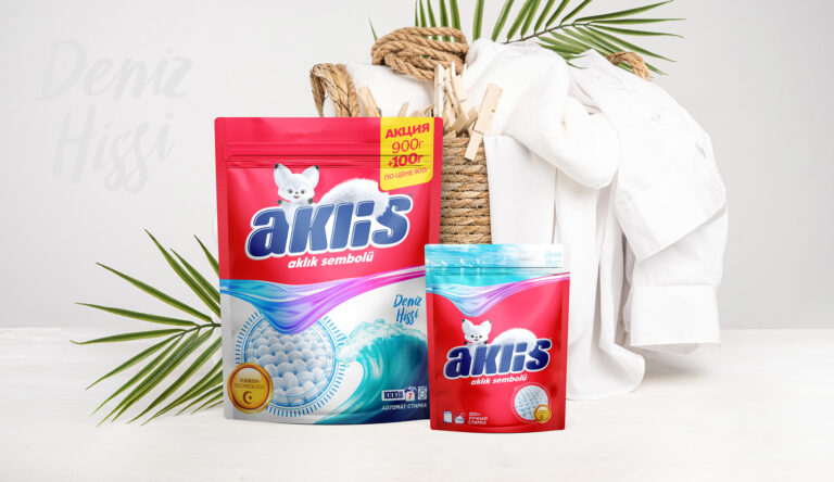 We named our powder “Aklis” — in honor of the arctic fox, a very neat and clean animal, that always keeps its fur snowy white. Aklis is a combination of two common languages in Uzbekistan: uzbek and russian. It makes the naming well understandable and easy-to-remember for our target auditory. Moreover, it reflects all the main features of the product and creates associations in the minds of customers that increases sales. Naming also became a basis for a logo of the product.