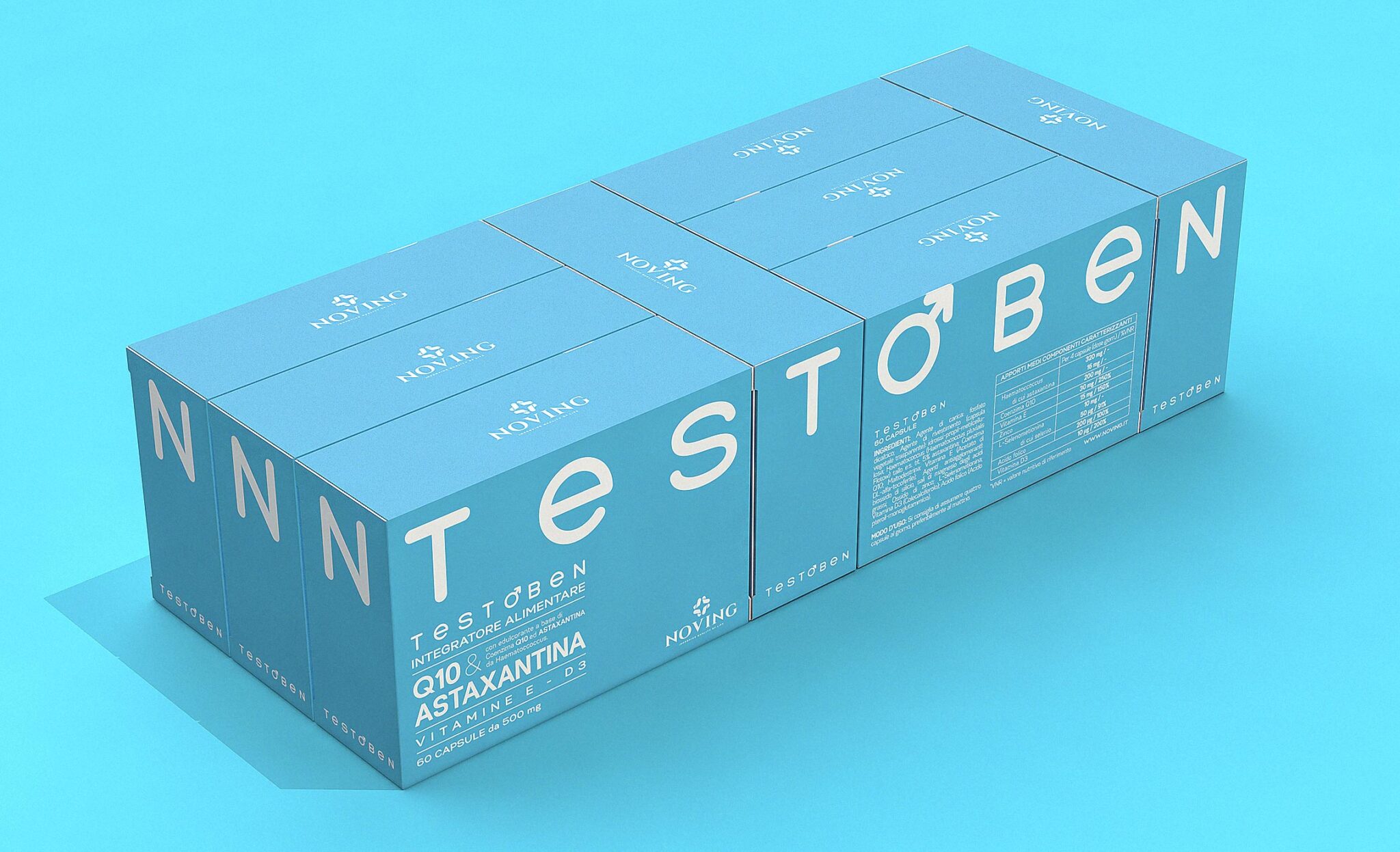 The name of the product (OVOBEN, GRAVIDELLE and TESTOBEN) graphically goes around the pack, in order to create, during the shelf display phase, a higher visibility compared to competitors, using the same space as the others. In addition to the product name and to the Noving brand, the packaging highlights the fundamental active ingredients contained in each supplement and its purpose of use, in order to make immediately evident which are the advantages of each product.