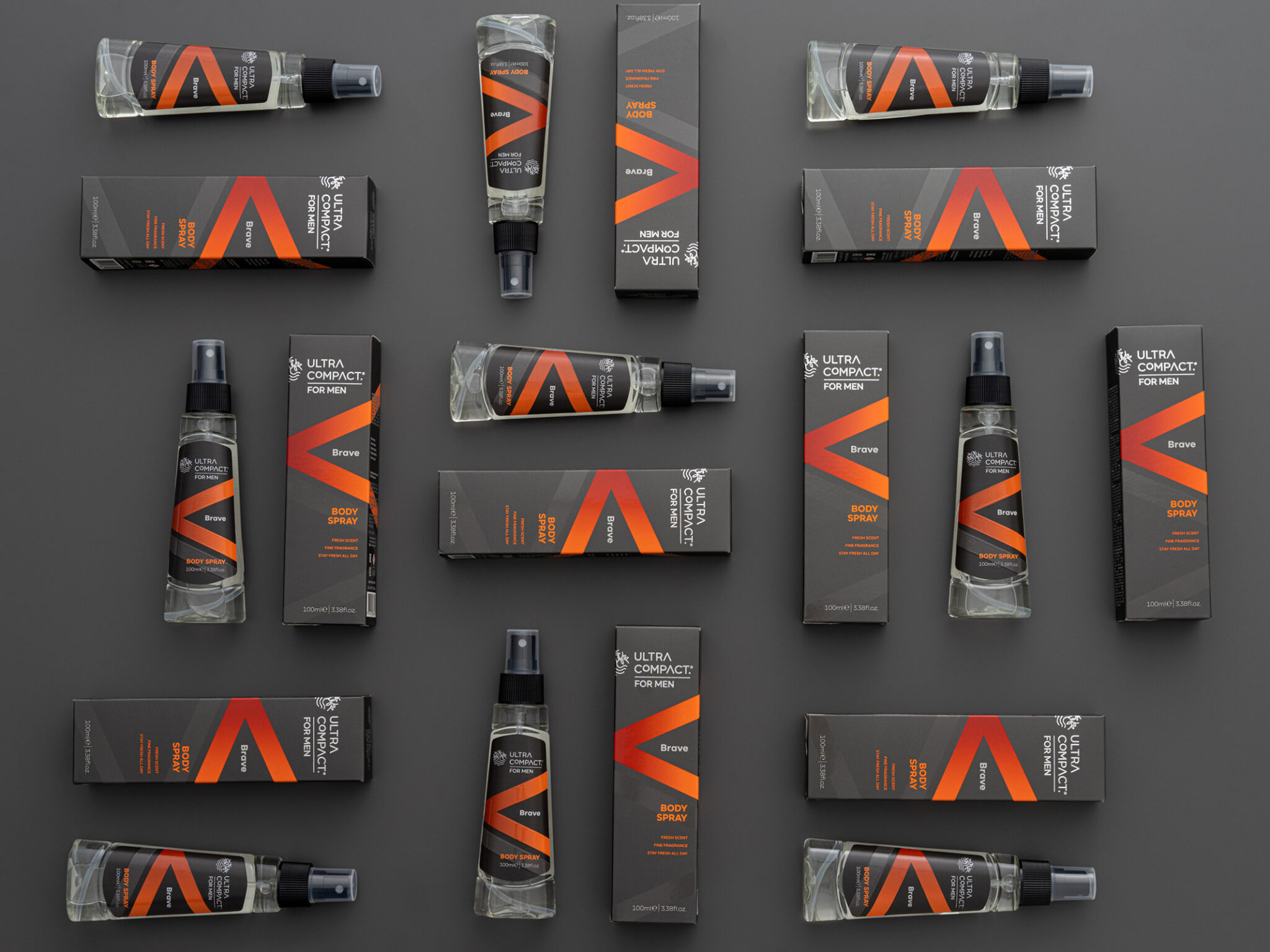 For the packaging design of Ultra Compact for Men, the agency created a modern minimalist architecture in dark grey shades in order to catch the attention of the male consumers as well as to differentiate from Ultra Compact woman range. A combination of matt and shiny finishes were used together with hot foil on the packages to highlight the premium positioning of the brand. Geometric lines with tone in tone layers on dark grey were used to achieve a simple yet dynamic look. The entire branding harmonizes with silver and vivid orange, the secondary color of the range.
