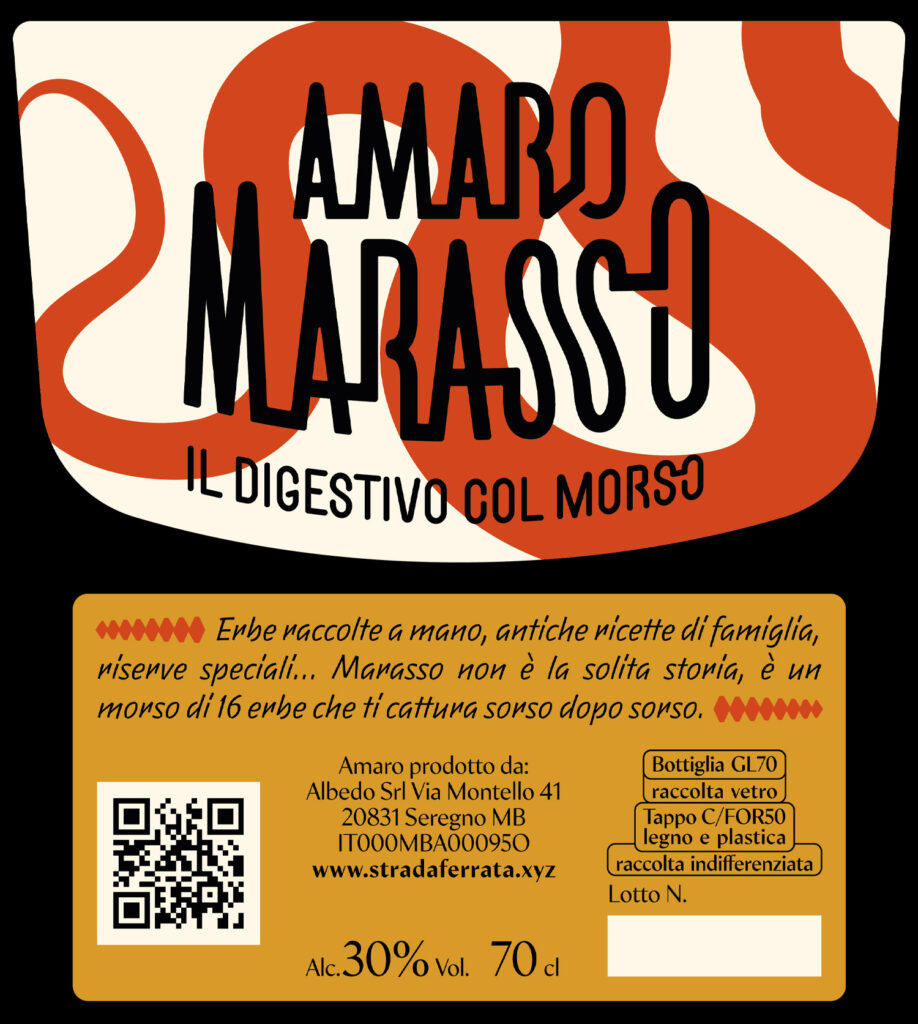 Enter Amaro Marasso, the new kid on the block made not in a remote Alpine village but right in the middle of suburban Milan. ‘Marasso’ is Italian for adder, and its bite makes up for its lack of heritage: 16 carefully selected ingredients are infused in each batch to give it an explosive aroma and a firmly bitter finish. Contrary to one’s habits, you can drink Marasso before or after dinner, neat or mixed, on ice or just as it is.