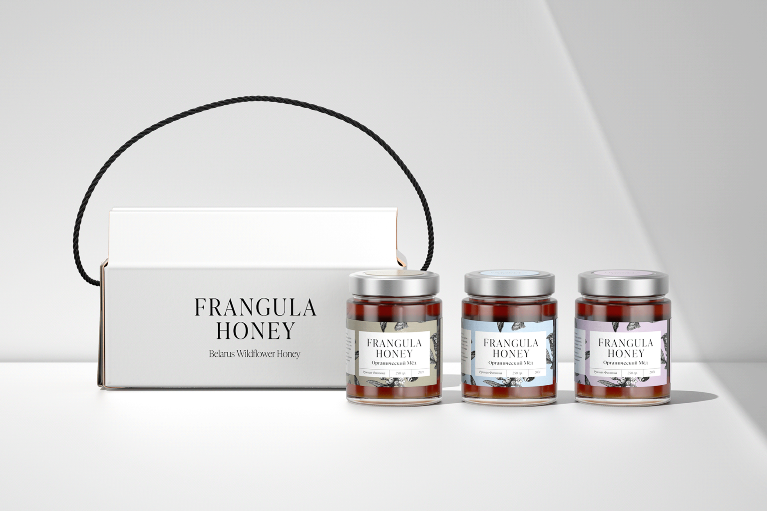 Boxes for Frangula Honey are inspired by traditional roofs of wooden houses in South of Belarus. Villages with architecture surround privately held beehives.