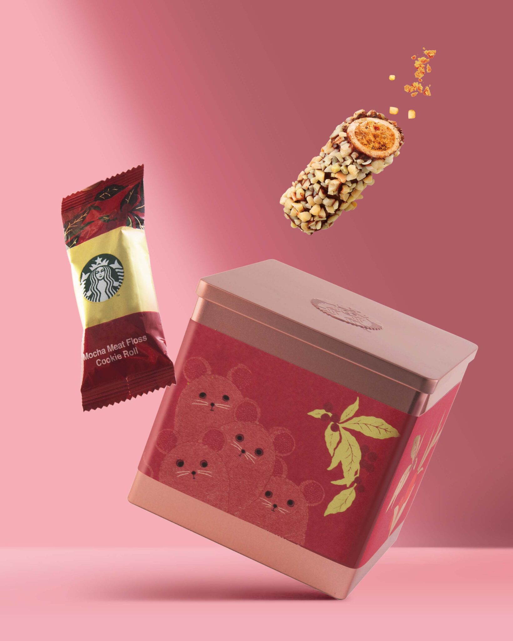The 2020 Starbucks Year of the Rat Gift Box (Mocha Almond Fluffy Roll) features a waist seal and inner pocket design with a foil and maroon background and hand-painted illustrations to present a festive atmosphere. In the picture, the special metallic color of the iron box was deliberately photographed to give the color texture a more layered feel, echoing the diverse flavors of the Mocha Almond Fluffy Roll cookies. The final image is combined with a jumpy composition to create a bit of youthful energy in the gift box!