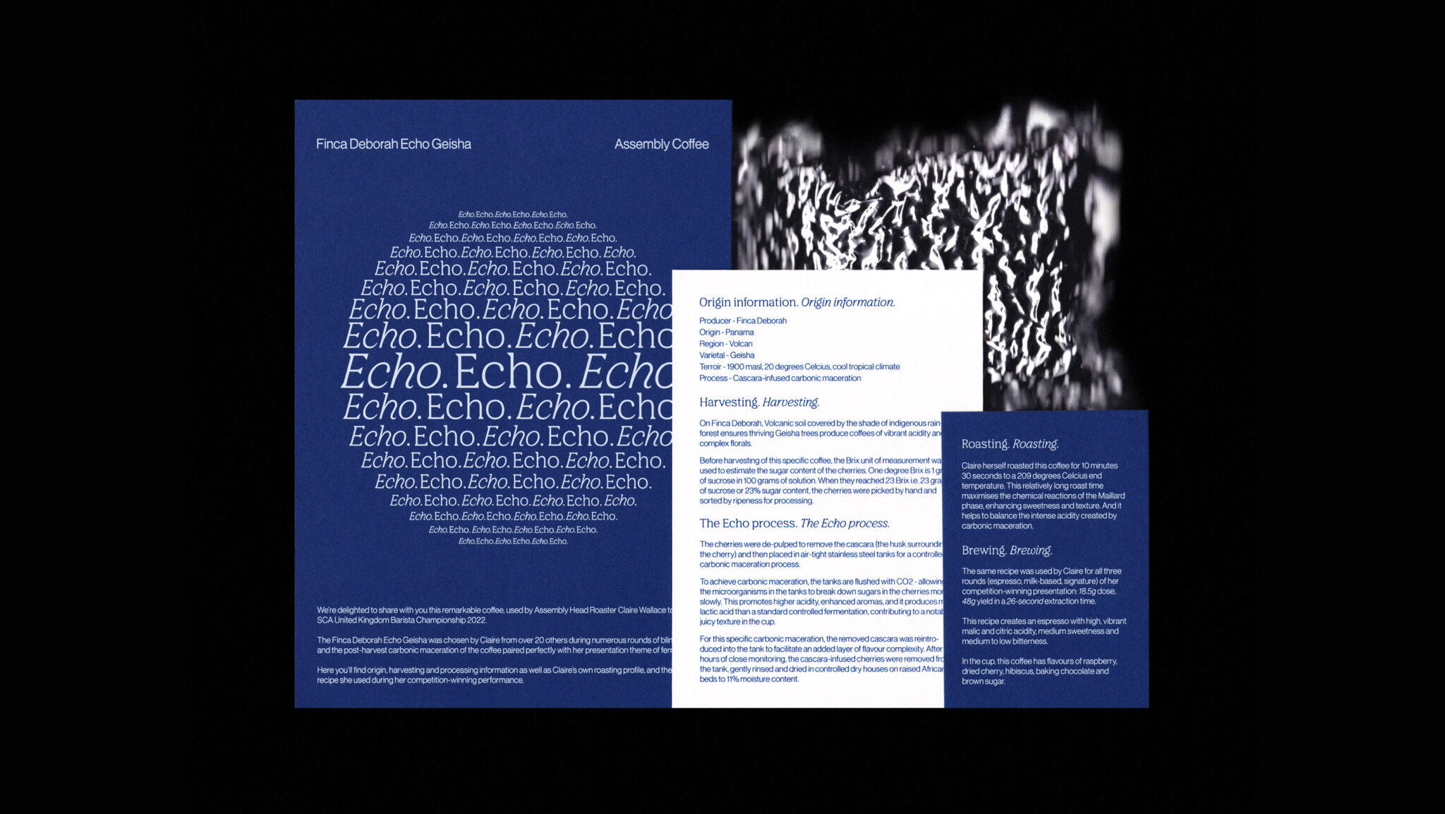 The main objective for this project was to create the packaging for the Echo Geisha, a coffee roasted, brewed, and served by Assembly Head Roaster Claire Wallace with which she won the UK Barista Championship in 2022.
