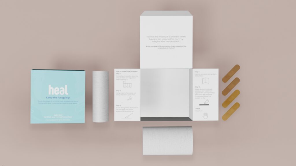 Heal is a hypothetical brand that offers a range of first aid products including bandages, ointments, and tools. Unlike traditional packaging, Heal’s packaging is designed to have a life beyond its initial use. Instead of being discarded, the packaging for each product and kit can transform into something new and useful. The packaging box here has a story prompt and characters printed on it, and with the instructions provided inside, it can be transformed into finger puppets. This innovative approach not only reduces waste but also encourages creativity and playfulness.