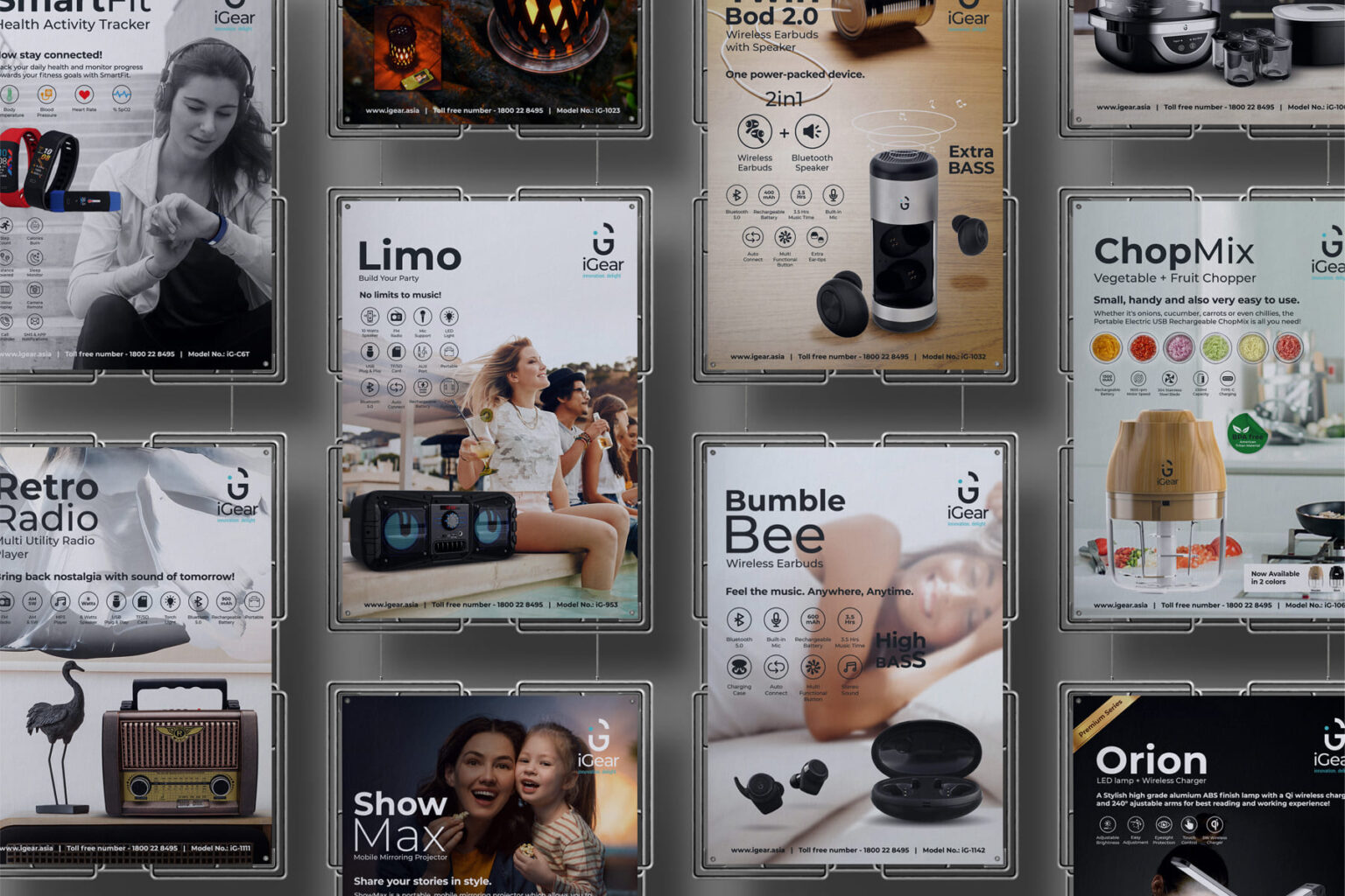 iGear Tech is an innovative electronic devices & gadgets company. This was a complete rebranding project starting with redesigning the Logo, Identity, Brand Guidelines, Website, Social Media, Launching and managing Market Places, and redesigning their existing 54 Packaging SKU’s keeping in mind the target audience and the USP’s of the products. We are now, working on a complete new range of product line which is launching soon.