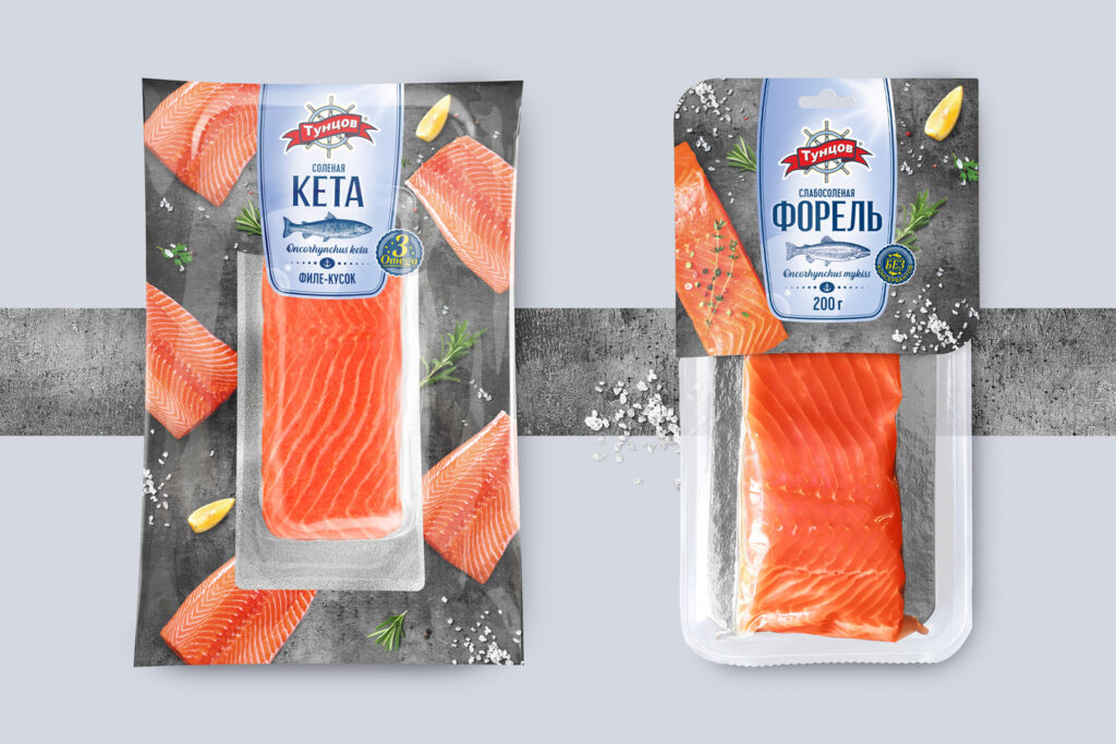 We were approached by the retail chain Maria-Ra with the task of creating a new visual concept and packaging for the Tuntsov brand. According to the terms of work, the old logo should remain unchanged. Different fish products are sold under this brand in the chain’s stores: from canned fish to red fish.