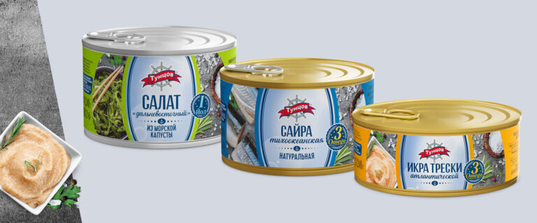The main idea was to create a certain visual code, which could be immediately read by a consumer and distinguish the product among competitors. When developing the visual identity of Tuntsov products, we thought of a single stylistic design of the brand-zone and the food area. The blue plaque with sunshine conveys the idea of sea freshness. It has become an easily recognizable design element.