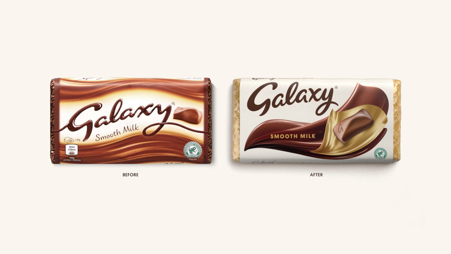 A more distinctive ‘chocolate flow device’ overlaid with expressive silk adds a spark of vibrancy and makes flavours easier to find. The white backdrop contrasts the new assets, including a hand-crafted script word marque. A range of vibrantly coloured silks expresses the portfolio’s diversity and heroes each flavour story for endless future innovations. With this design focused on flow, silkiness, layers and contrasts, Dove/Galaxy inspires a sense of pride and shameless indulgence in the smoothest way possible.