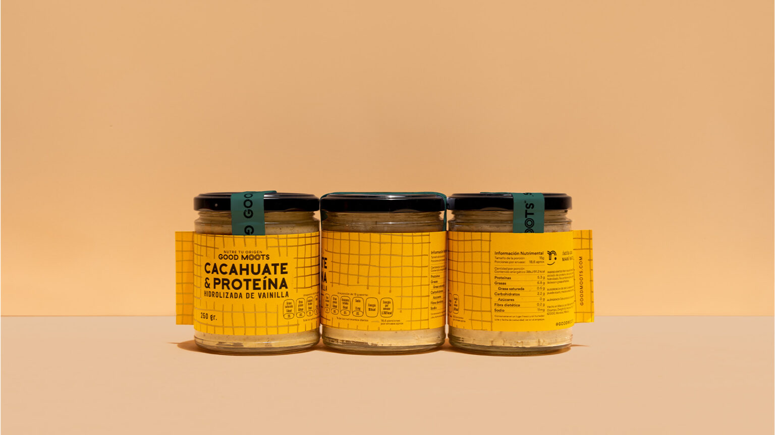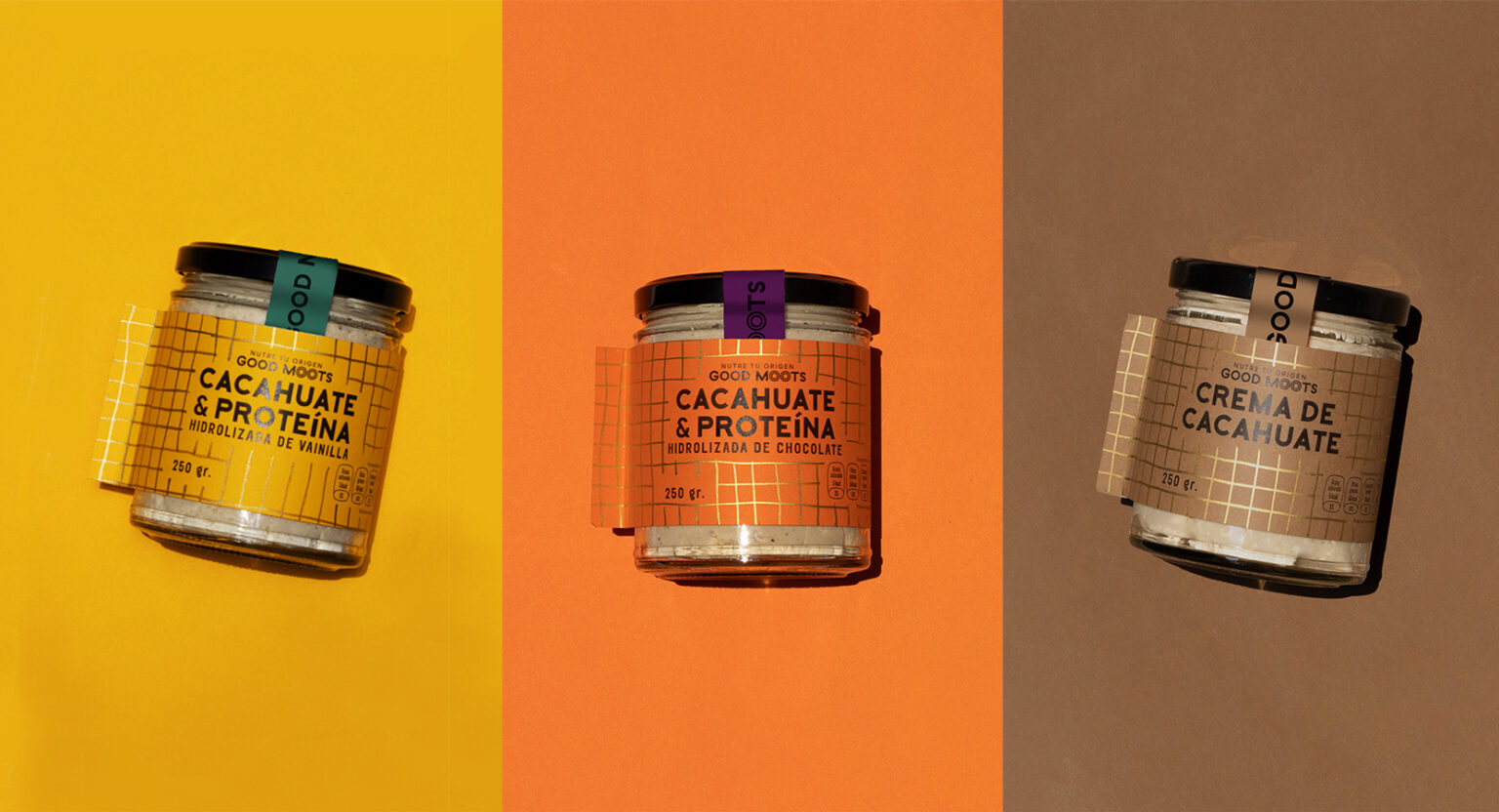 The conceptualization of the brand name was part of the project. With this we sought to present a proudly Mexican identity through a relaxed and fun tone. The name is a combination of words: good, from the English that we all know, and moots from the Mayan meaning root or origin. In one sentence it would be read as “good roots or good origins”. We literally refer to the roots where peanuts grow and the pre-Hispanic origin of peanuts as a superfood and how we brign those concepts to a contemporary market.