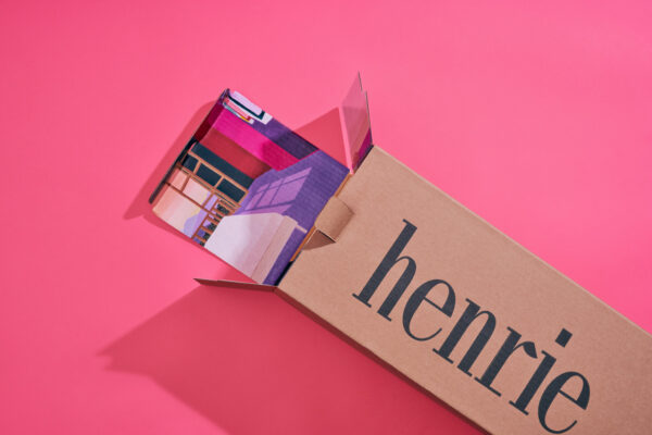 Henrie’s design language transports you into a world of your dreams by merging a beautiful wordmark, calming, and elevated photography with paintings representing dream-like views of the bedroom. Glasfurd & Walker worked with Milan- Based artist and illustrator Clara Rubin to depict three imaginative bedroom spaces that inspire a deep rejuvenating sleep. The illustrations are woven throughout all the brand touchpoints, including a beautiful shipping box that opens to reveal the custom artwork.