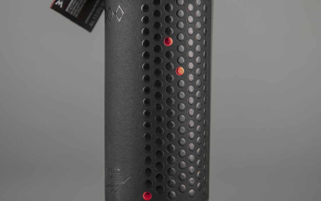 We selected the highest quality paper which emulates the core of the wine, it gives it an elegance, an exclusiveness that says, only a special few can possess one of these special bottles. The color black represents the Spartan’s armor, the front label design comprises of 300 dots, they are a symbolic vision of these brave Spartan soldiers, they also represent the 300 special limited-edition wine bottles. The 3 red dots on the front of the label were highlighted “tamped”, they are also on the tag, on the Devereux’s Coat of Arms, as part of the whole design concept, they represent the 3 partners.