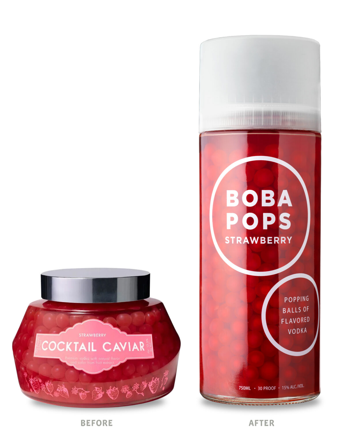 Unifying Spirits came to CF Napa with the task of reinvigorating their newly acquired brand Cocktail Caviar. As the first alcohol-filled popping boba product, the brand faced challenges with consumer education. The brand name created some confusion, bringing fish egg caviar to mind as opposed to an exciting, unique alcohol beverage choice. With non-alcoholic popping boba increasing in popularity, it was imperative that the new design capture this audience with the promise of a fun and trendy drink option under the new brand name Boba POPS.