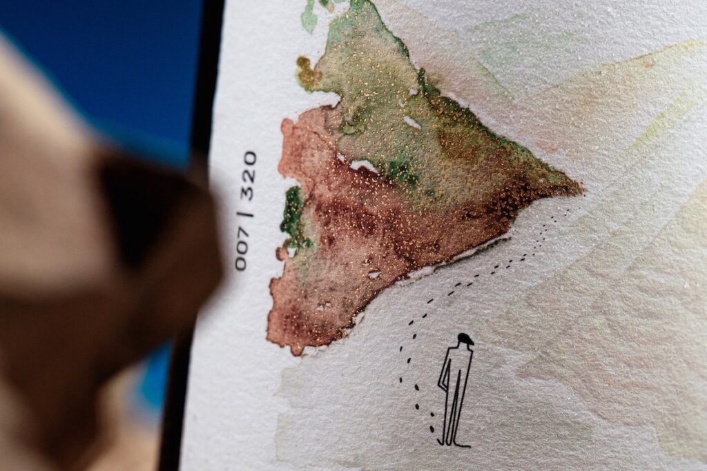 Viosinho & Encruzado represents respect for the environment, conscious agriculture, responsibility for the quality of what is produced, and respect for future generations: it represents, succinctly, the balance between Man and Earth. The spot of color, in a triangle, illustrates this natural and fragile balance. Gouveio & Encruzado is a stroll through the Douro, a tribute to the Mediterranean forests. The character walks through the landscape, leaving footprints that disappear on the horizon.