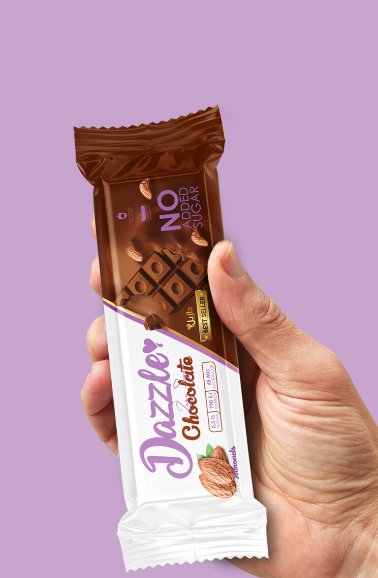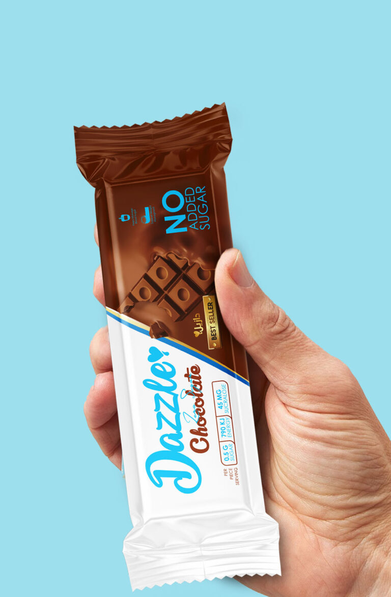 Dazzle is a chocolate product for diabetes patients where it has no added sugar. It has 3 flavours; plain, almonds and hazelnuts. The design is made to make you feel the chocolate melting in your mouth in an elegant way with a mix of brown, white, and another light color to give this light-lifting feeling, it’s chocolate but it is healthy.