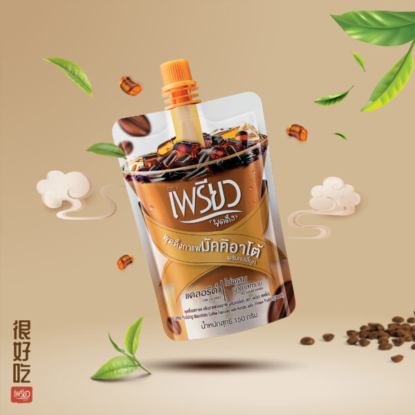 For the first time, this new innovation of drinkable tea and coffee pudding pouch is introduced in Thailand. The packaging design is inspired by freshly brewed Taiwanese Milk Tea in a cup, ready to be served. The ribbon is inspired by the measuring tape to portray the lightness of the pudding, perfect snack for those who are concerned about calorie consumption.